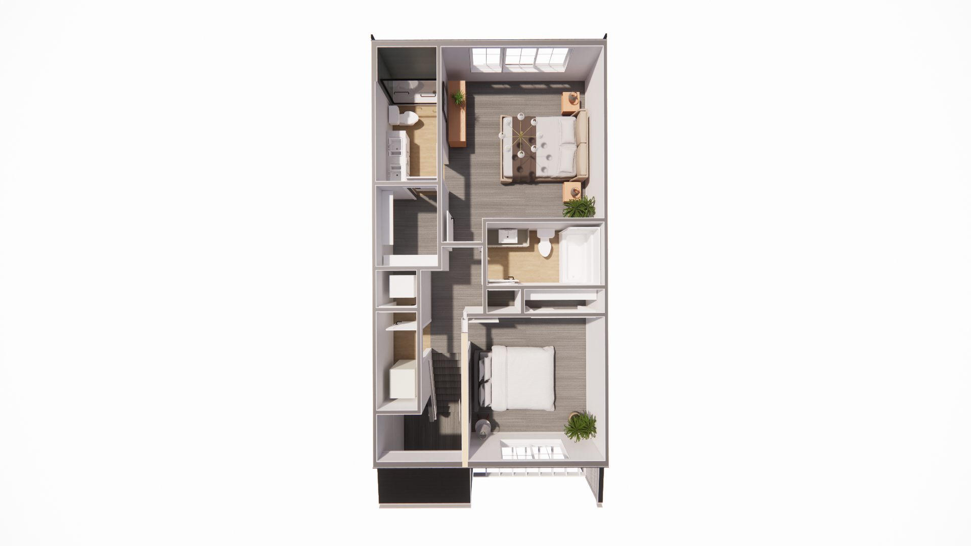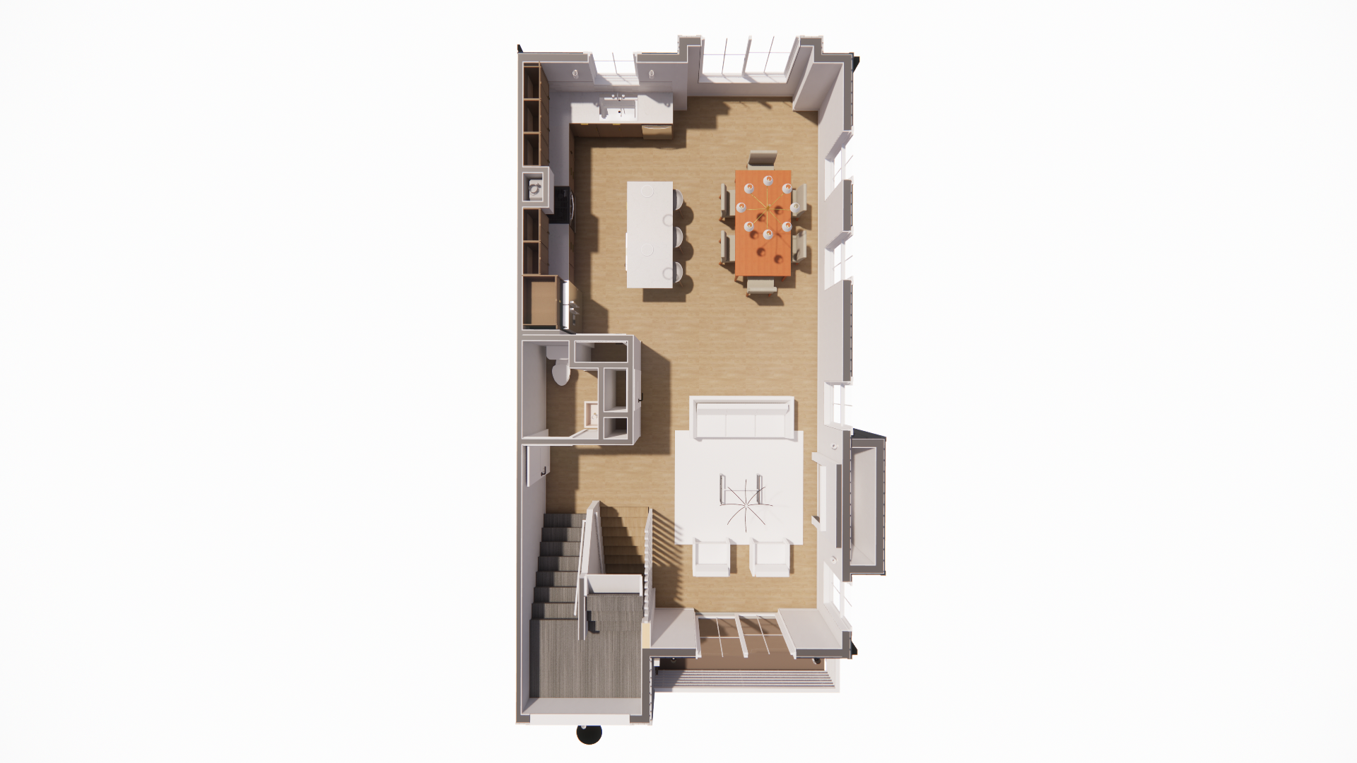 The second floor offers an open concept main floor including a generous kitchen, living room with gas fireplace, dining, powder bath, and deck off the living room. All exterior units have abundant windows and natural light flooding the main spaces.